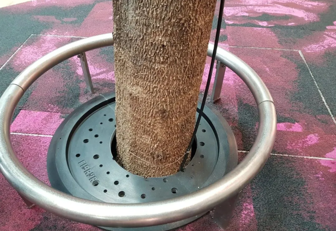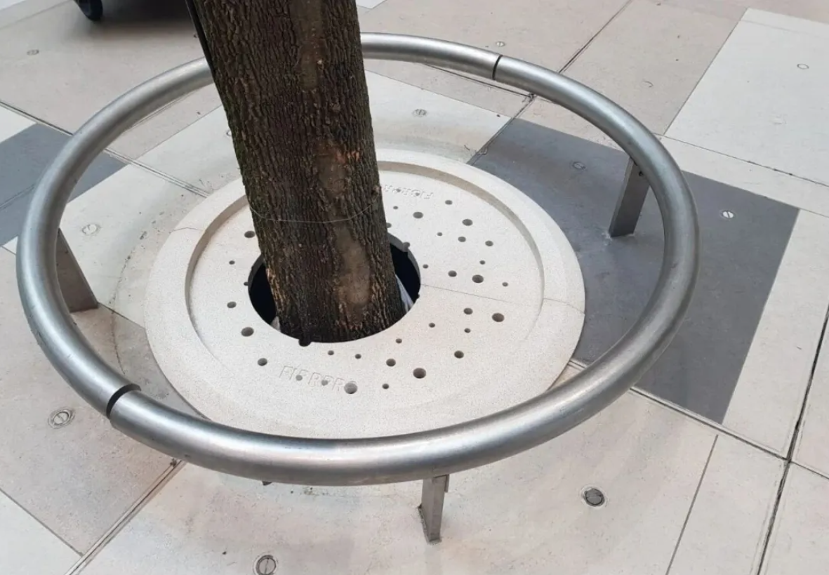 这些本该默默守护树木生长的盖板,在波斯湾特有的高盐分空气侵蚀下,短短数月就出现了严重锈蚀。更令人担忧的是,翘起的铁皮边缘可能划伤嬉戏的儿童,而锈斑随着灌溉水渗入土壤,不仅影响植物生长,更有可能污染沙漠地区珍稀的地下水源。当地园林部门不得不频繁更换这些“短命”的盖板,陷入了“更换-生锈-再更换”的循环。全球智慧:看新加坡和香港这对”双子城“如何破解树洞盖板难题在新加坡樟宜机场,每天数万名旅客穿梭于室内森林中,其树洞盖板需要同时满足高承重、可持续扩孔与极致美学的三重标准。菲普创新的合成石材,让盖板与地面铺装浑然一体,甚至成为了景观的一部分,也成就了新加坡国门的荣光。