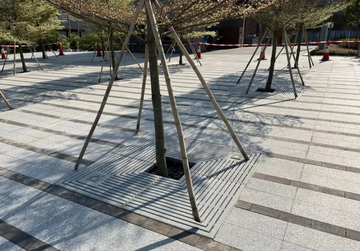 而红磡海心公园坐落于维多利亚港畔,常年面对高盐分海风与潮湿环境的反复侵蚀,其采用的善必德®树洞盖板展现了卓越的耐腐蚀性与环境适应性。经过三年密集使用,这些树洞盖板在维港盐雾的持续考验下依然保持光洁平整,无任何锈蚀或变形现象,有效避免了传统金属盖板因腐蚀而产生的安全隐患。
