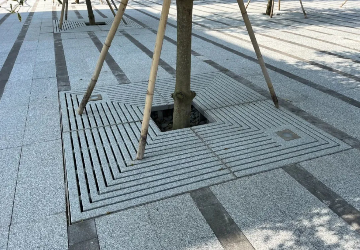 盖板表面特有的防滑处理与边缘圆角设计,不仅提升了雨天行走的安全性,还完美融入公园的苏州园林风格,成为景观的有机组成部分。这种设计恰恰与沙特达曼公园的波斯湾环境高度相似——两者均处于高盐度海滨地带;身处户外,面临盐雾腐蚀、高温高湿的共同挑战且同属于正方形的盖板形状。但海心公园的树洞盖板通过材料创新实现了长效稳定,从根本上杜绝了频繁更换的维护负担,为达曼公园提供了经过实践验证的可靠解决方案。